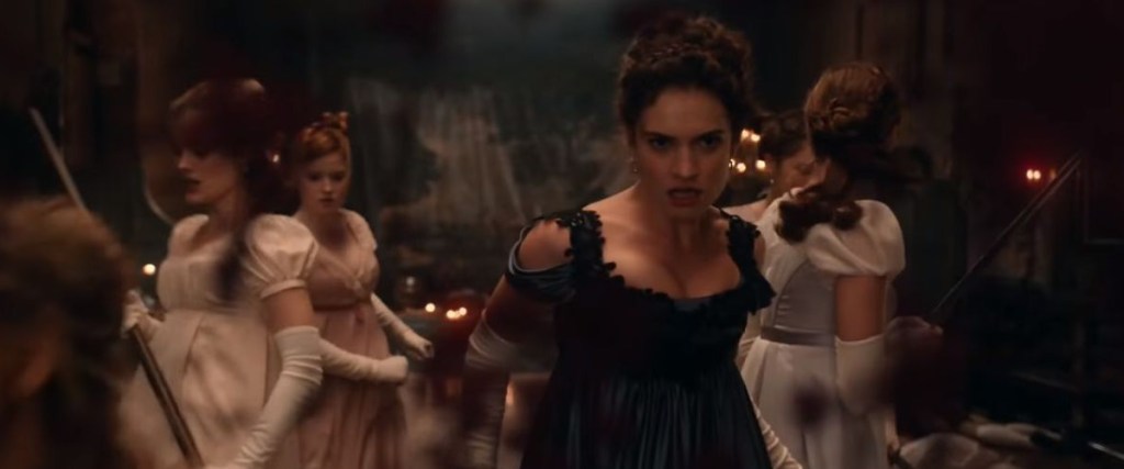 What is the biggest undoing this film though is that they have made it into a “comedy” action horror movie with romantic elements instead of keeping it as a romantic horror comedy with action elements. Jane Austen’s novel is a comedy and excellent source material that lends itself surprisingly well to the zombie elements, including having a militia camped nearby. The mash-up is what makes the 2009 novel so unique, and turning it into just another zombie flick greatly diminishes that. Most of the Austen beats are still in there, but they take a backseat to the action and the zombies and the tacked on “End of Days” apocalypse that wasn’t even in Grahame-Smith’s parody. If they had kept it as a mostly straightforward retelling of Pride and Prejudice and sprinkled in the zombies and the martial arts like the novel had, it could have been much more interesting.